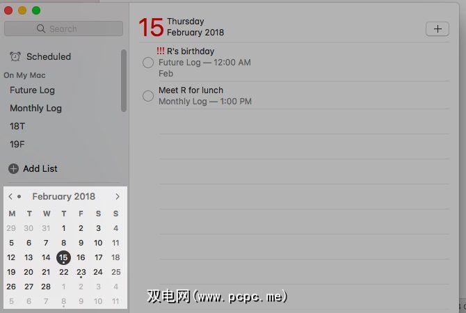 保留小日历通过点击查看>显示日历,在侧边栏底部显示。您会看到每天安排了一个或多个提醒的小点。单击这些点之一可在右侧查看相应的提醒。对于每个提醒,您都会看到它所属的列表的名称,这很方便。
