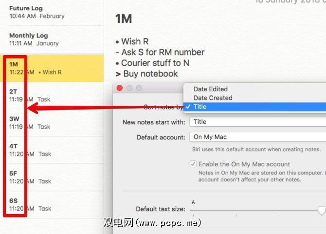 使用数字1-30(或31)命名“每日日志"笔记,以使其更容易在笔记列表中识别。如果您想以典型的Bullet Journal方式投入一周的相应日期的开头。另外,将注释>首选项下的注释依据:选项设置为标题。然后,将根据日期以正确的顺序显示每日日志。单击注释顶部的浅灰色时间戳,以在其“创建"和“编辑"日期之间切换。
