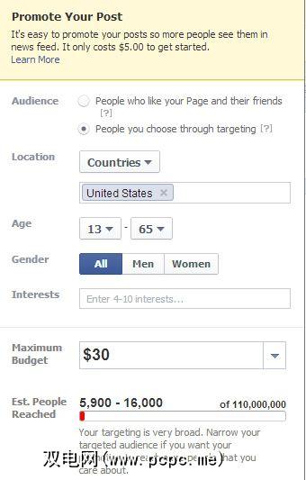 从图片中可以看到,您可以将自己的帖子提升到现有的粉丝群,或者您可以扩展目标受众,以将特定人群中的用户包括在内。如果您的粉丝群不多,那么增加粉丝群将是增加喜欢您网页的人数的好方法。如果来自那些吸引了更多观众的人喜欢您的信息页,那么这将有助于增加您的自然覆盖面,因为您的信息页的更多喜欢意味着更多的人会免费看到您的信息。