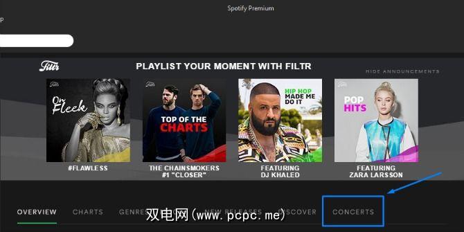 这很简单。只需打开您的Spotify桌面播放器,然后单击“音乐会"即可,如上面的屏幕截图所示。