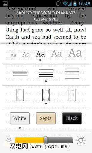 Android Kindle应用程序允许您设置屏幕亮度,首选屏幕方向(横向)或纵向),字体大小和背景色。通过这些选项,您可以设置适合自己的阅读环境。