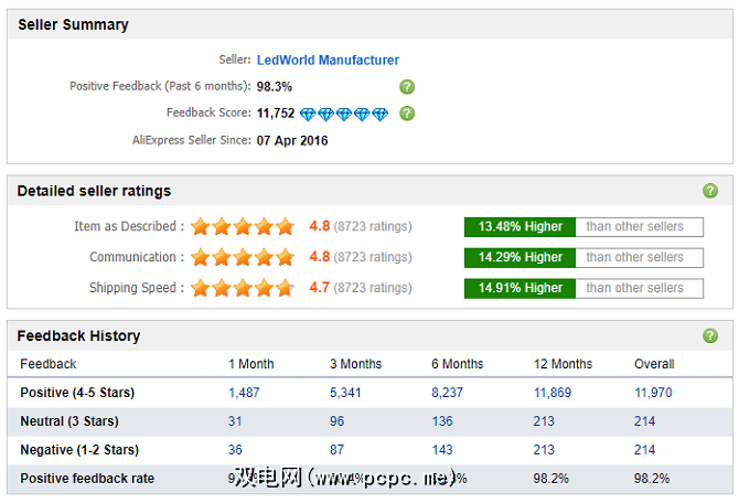 每个卖家都有积极反馈百分比和反馈分数。反馈分数是所有评分的总和,转换为分数。四星级和五星级的评分合计一分,三星级的评分为零,一星级和二星级则减一分。