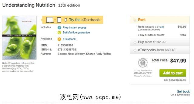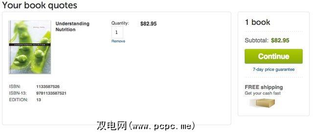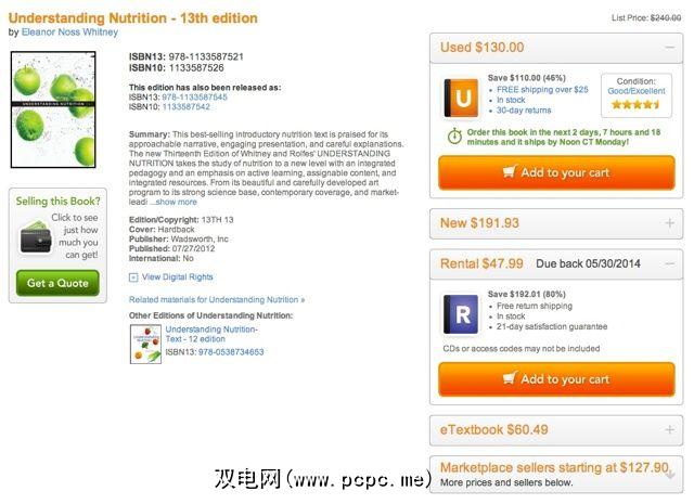 现在,如果您要购买同一本书,那么Textbooks.com的价格更实惠。在此示例中,Textbooks.com的“ Understanding Nutrition,第13版"仅售130美元,而Chegg则标价132.99美元。不过,如果您不喜欢用过的书,Chegg希望Textbooks.com胜出购买新书,价格为187.99美元,而Textbooks.com则为191.93美元。价格在撰写本文时是准确的。