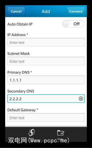 BlackBerry 10也允许您为Wi-Fi网络设置自定义DNS服务器。 。首先,通过从顶部向下滑动并点击系统设置来打开“系统设置"屏幕。点击网络和连接> Wi-Fi ,然后更改其中的设置。您可以在添加新的Wi-Fi网络或编辑现有的Wi-Fi网络时设置自定义DNS服务器-只需禁用“自动获取IP"选项并设置自定义DNS服务器即可。