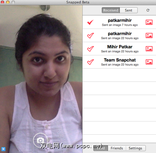 Snapped将带Snapchat的收件箱和实时预览,并将它们置于两窗格视图中。左窗格是您的相机,它模仿了iPhone的方向(但显然使用了Mac的网络摄像头)。您还可以点击加号(+)的小图标从硬盘中添加图像,这与通常的Snapchat方法不同。
