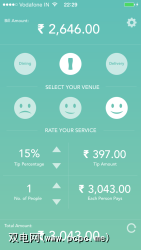 所有设置完成后,小费变得非常容易。输入帐单金额,选择部分,然后通过看着笑脸对服务进行评分-这很不错,您无需直接处理数字,而可以处理情感。添加人数,您将获得总金额以及每个人欠款的最终分配。