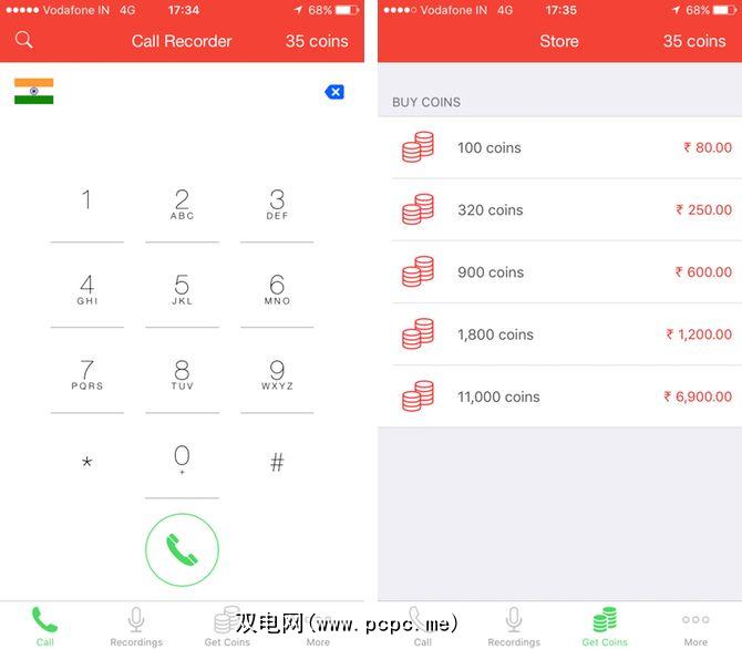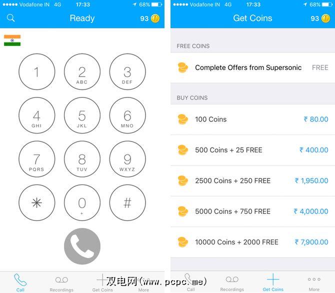 您已经有了拨号盘和用于自动为国家/地区代码加上前缀的国家/地区选择器。通话记录代替贷记,而是使用“硬币"作为虚拟货币拨打电话。开发人员以略高于1美元的价格出售100枚硬币,打到印度的电话每分钟收费15枚硬币(这意味着每分钟略高于15美分)。如果您购买了100枚应用程序内购买的硬币,则可以在信用用尽之前致电印度6分钟。