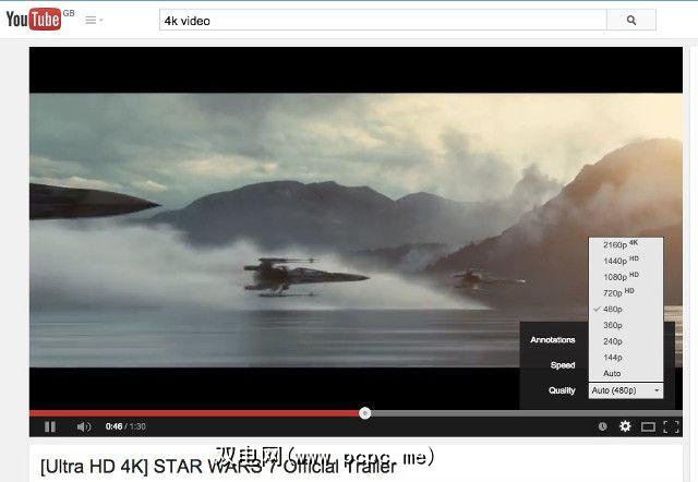 如果不确定所观看的视频是否支持4K,只需点击在视频底部边框上的齿轮上并调整分辨率;如果它达到2160p,那就太好了!