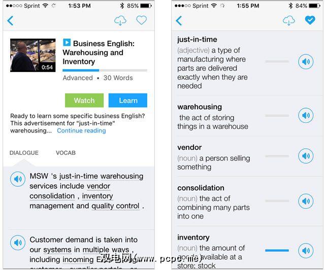 FluentU for iOS提供了商务英语视频,音频剪辑和抽认卡。您可以听对话以及查看和听到相关的词汇。视频在播放时会显示文本,并可随时暂停以获取有关特定单词和短语的更多详细信息。该应用程序具有15天的免费试用期,之后提供每月或每年的订阅。