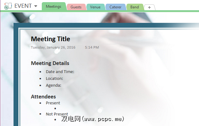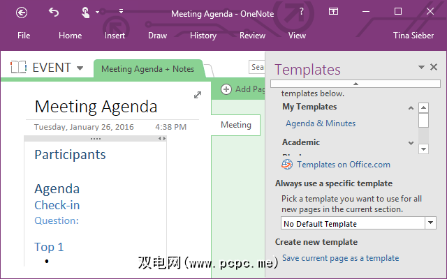OneNote附带了一些预设模板,包括几种不同的会议笔记模板。