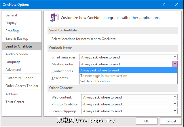 除了Outlook电子邮件,您还可以共享其他来源的内容。若要自定义OneNote处理传入内容的方式,请转到文件>选项>发送到OneNote 。您可以为Outlook项目,Web内容,“打印到OneNote"和屏幕剪辑选择自定义设置。默认设置为总是询问发送到哪里。