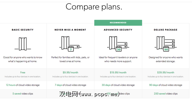 首次设置设备后,您将免费试用“永远不会错过片刻"计划,该计划通常每月需要支付9.99美元,其中包括一周的录音以及50个保存的视频。计划的最高价格为40美元。