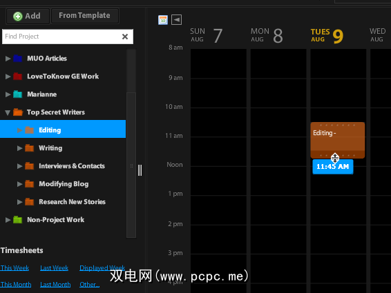 布局简单,但一切尽在您的指尖。所用时间的日历显示在右侧,所有项目都列在左侧。然后,所有的时间表报告和存档都位于左下方,当然菜单也位于顶部。