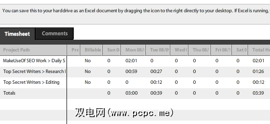 单击窗口左下角的任何时间表链接,您将查看时间表的详细显示,包括您已记录的所有时间和已登录的所有项目。时间细分为每天以及总时间。如果您已将任何任务标记为可计费,那么您也会在此处看到这些总数。您可以将这些信息保存为Excel电子表格,从而使您的客户账单变得轻而易举。