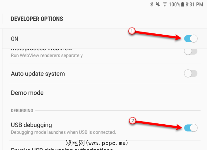 点击开发者选项,并确保其位于屏幕顶部打开。然后,点击 USB调试滑块按钮将其打开(滑块变为蓝色)。