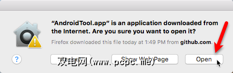 运行AndroidTool应用。您会看到以下警告对话框。点击打开。
