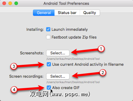转到 AndroidTool>“偏好设置" 。在常规屏幕上,您可以选择 AndroidTool在其中保存屏幕截图和屏幕录像的位置。如果要让每个屏幕截图的名称包含所捕获内容的描述,请选中在文件名中使用当前Android活动框。