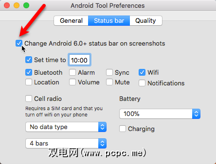 单击对话框顶部的状态栏。选中更改屏幕截图上的Android 6.0+状态栏框。然后选中您要显示或更改的项目的框。例如,您可以使用设置时间为框将时间更改为特定时间。然后,您可以设置电池级别,并选择是否希望其显示为正在充电。