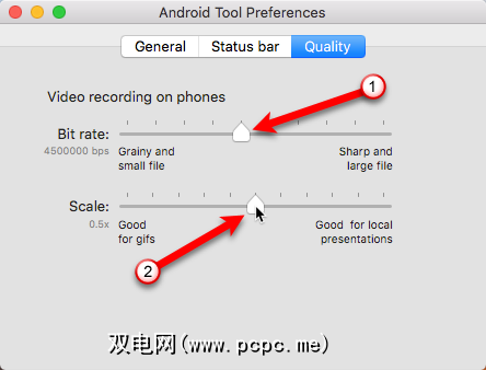 更改视频录制的质量,点击质量。通过向右或向左拖动每个滑块来更改比特率和缩放。