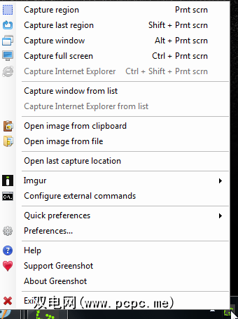 在安装Greenshot后,您可以通过单击系统任务栏图标并选择所需的屏幕截图类型来截取屏幕截图。否则,更快的方法是只按所需的屏幕快照模式的热键组合。