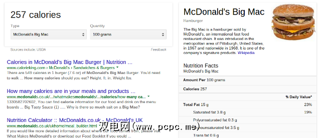 要查找有关任何快餐食品的营养信息,只需询问Google是否通过输入问题或使用语音搜索。一个典型的查询可能是“巨无霸中有多少卡路里?",它将提供所有的营养信息,包括饱和脂肪,胆固醇的水平以及实际上的卡路里。