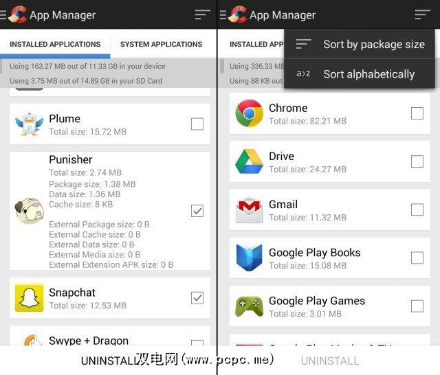 转到“应用程序管理器"部分,您可以按大小或字母顺序对应用程序进行排序,及其名称,图标和总大小。点击任意应用程序,您将获得更多信息,例如程序包大小,数据大小,缓存大小,外部媒体大小等。选择要卸载的软件,然后点击底部的大“卸载"按钮。 CCleaner会提示您单击“确定"以删除每个应用程序,但比手动卸载每个应用程序要容易得多。