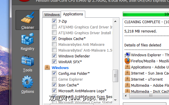 您没有看错:运行CCEnhancer后又多了5GB。请记住:这是我已经删除的8GB存储器的补充。可能的教训是,我应该更频繁地清理媒体中心。但是这里的另一个教训是CCEnhancer可以发挥很大的作用。对我来说,亮点包括Dropbox缓存,Chrome的临时文件,WinRAR,WMP艺术缓存和VirtualClone,但是释放的资源更多。
