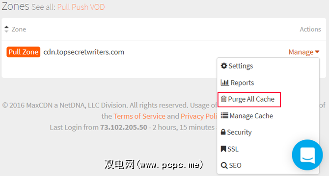 For MaxCDN, this can be found on the dashboard page. Look under the configured zone for your site, and clicking on the Manage button.