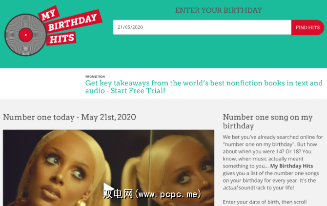 键入您的出生日期,然后网站会分别生成该日期在美国排名第一的歌曲的网格。单击任意歌曲以将其打开并带有嵌入式YouTube视频,以及有关其停留在顶部多长时间的更多信息。如果您有兴趣,“我的生日精选"也将成为该年的顶级电影和顶级书籍。
