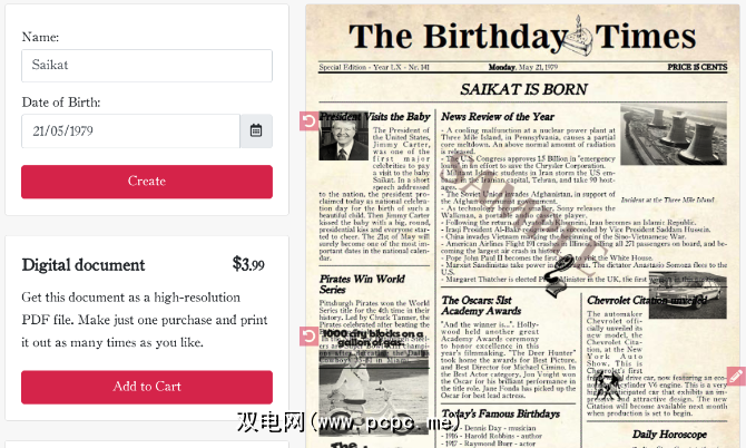 报纸页面是纪念生日的一种很酷的方法。生日时报可让您从出生那天起就创建一个伪造的报纸页面,但是在试图看起来真实的过程中还有很长的路要走。它充满了小东西,可以让您自定义该时代,让它活着。添加您的姓名和生日以及开始的年份。