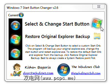 选择一个,程序窗口将更改以反映您的选择,并且explorer.exe将重新启动。现在您应该可以看到新的开始球了!