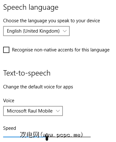 下面的选项-文本到语音-您可以在其中进行选择可以选择Cortana使用的声音。每次您安装语言包时,也会安装相应的Cortana语音。从下拉菜单中选择您的首选项。