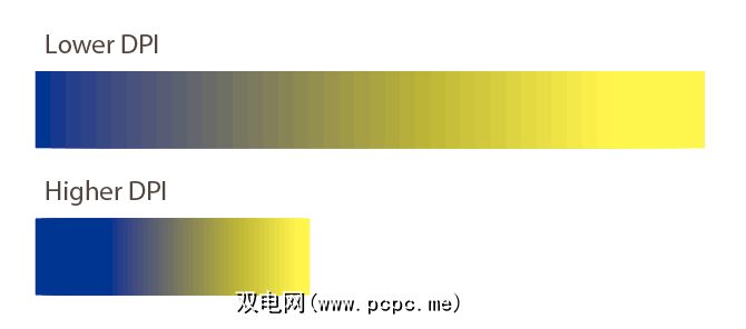 效果显而易见。在 DPI降低行上,渐变不太平滑。您可以在每个正方形上看到清晰的边缘。该行也更长。