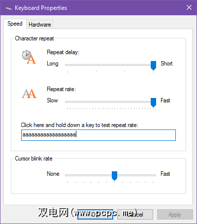为什么要这个?嗯,当您要删除大量文本(按住Backspace或Delete键)以及在文本编辑器中导航(按住箭头键)时,它会有所帮助。我个人选择了最短的延迟和最快的速率。