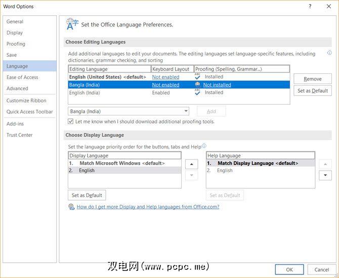 注意:编辑语言由键盘布局和该语言的校对工具组成。校对工具包括特定于语言的功能,例如用于拼写和语法检查的词典或段落方向按钮。
