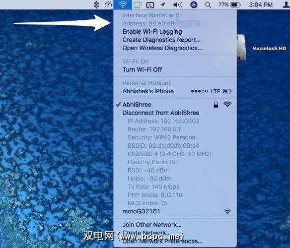 如果您的Mac已连接到Wi-Fi网络,您可以从菜单栏本身查看MAC地址。只需按住Mac键盘上的 Option 键,然后单击 Wi-Fi菜单栏图标。