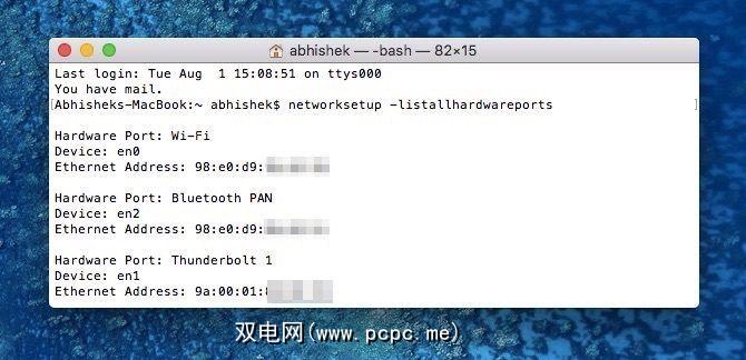 如前所述,每个网络卡具有自己的MAC地址。如果需要找出Bluetooth PAN或Thunderbolt端口的MAC地址,请按以下步骤操作。