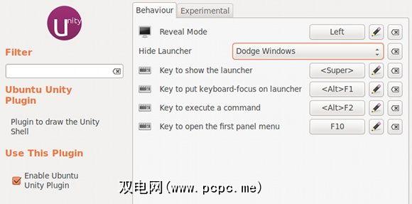 在行为标签中,我们会找到几个与Unity的行为有关的选项,尤其是左侧的停靠栏。您可以选择显示模式以及启动器(扩展坞)应隐藏的时间。这些选项下面是用于各种任务的配置键盘快捷键。