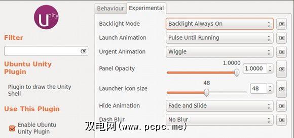 除了一个选项外,此选项卡中的所有选项都会影响扩展坞。更改 Backlight Mode (背光模式)将更改扩展坞中图标的背景是否始终是彩色的(仅在打开应用程序时),或从不打开。 启动动画选项可以更改单击图标时图标的显示方式。 紧急动画是指某个应用程序试图引起您的注意,例如有人在IRC程序XChat上提到您的昵称。您还可以更改面板不透明度,启动器图标大小和隐藏动画。 Dash Blur 选项可让您选择所需的破折号模糊类型,即单击左上角的Ubuntu徽标时出现的窗口。
