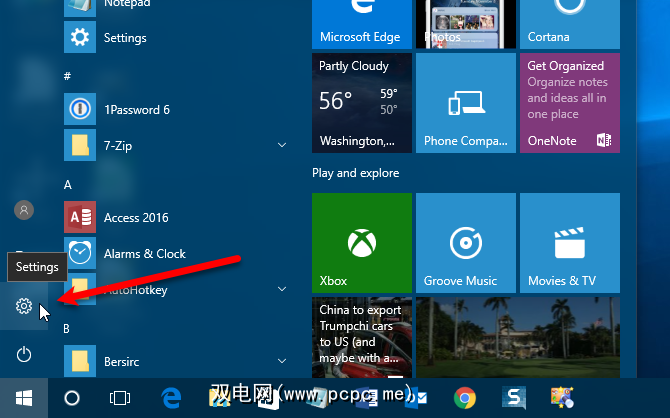 地区和语言选项位于系统设置中。单击开始按钮,然后单击“开始"菜单左侧的齿轮图标。