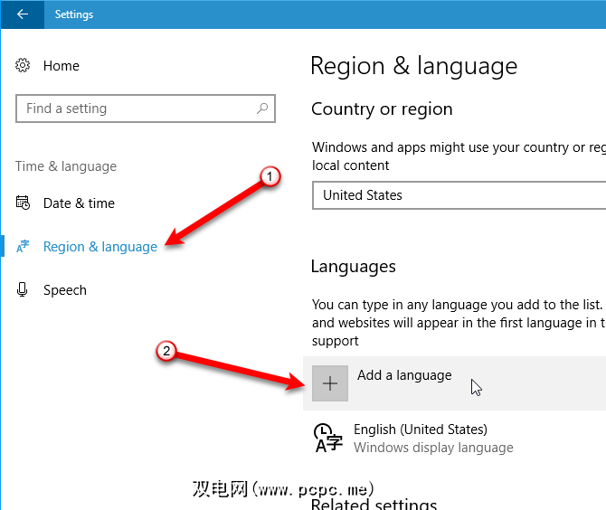 要添加语言,请点击时间和语言屏幕左侧的地区和语言然后单击右侧的添加语言。