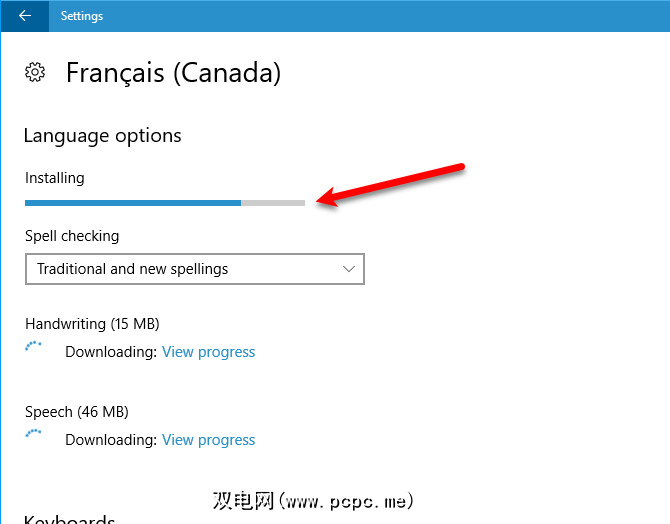 语言包安装完成后,显示消息已安装语言包。 手写和语音选项可能不适用于所选语言。如果是这样,请单击设置以设置选项。