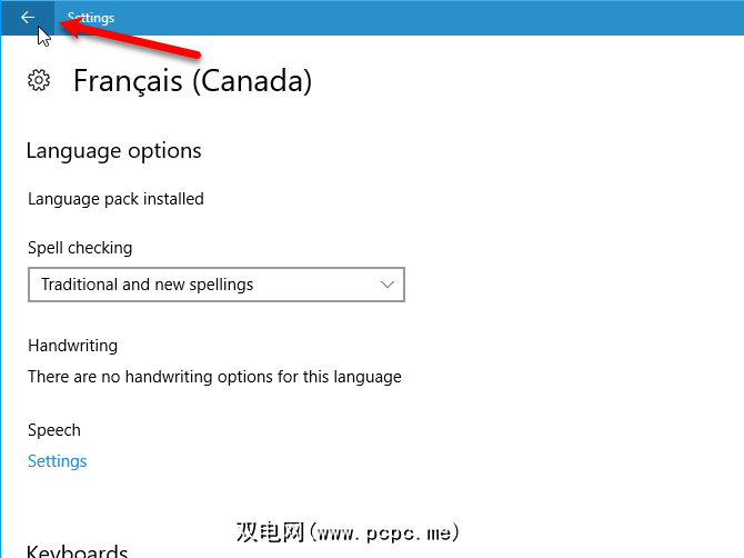单击窗口左上角的左箭头以返回到区域和语言屏幕。