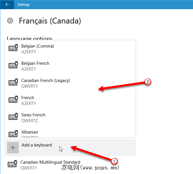 默认情况下,会为您选择的语言添加标准键盘。如果要添加另一个键盘,请单击添加键盘,然后从弹出列表中选择一个。