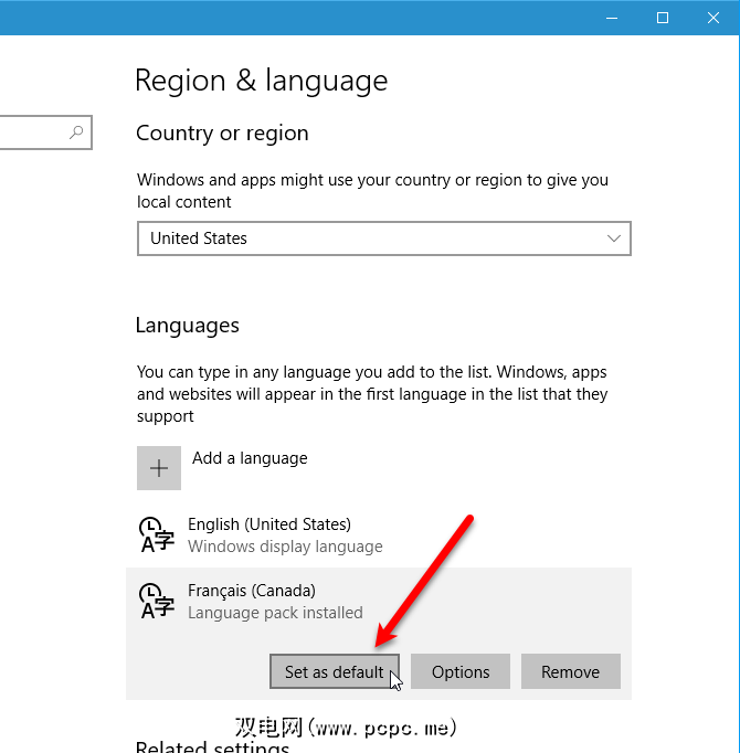 一旦下载并安装了语言包,就可以使用该语言了。 。要将新添加的语言设置为默认语言,请在区域和语言屏幕上单击该语言,然后单击设置为默认语言。