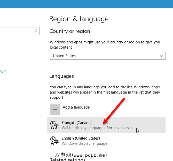 选择语言后,该语言将添加到“地区和语言"屏幕上的语言下的列表中。