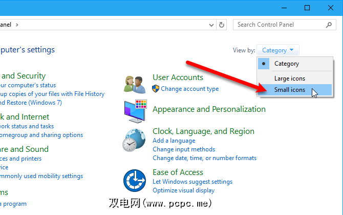 在控制面板窗口的右上角,从查看方式下拉列表中选择大图标或小图标。