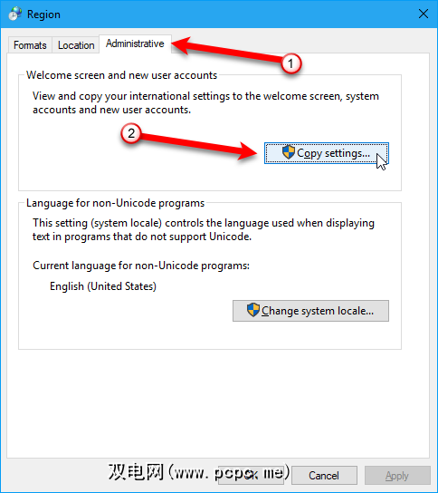 在区域对话框中,单击管理标签。然后,单击复制设置。