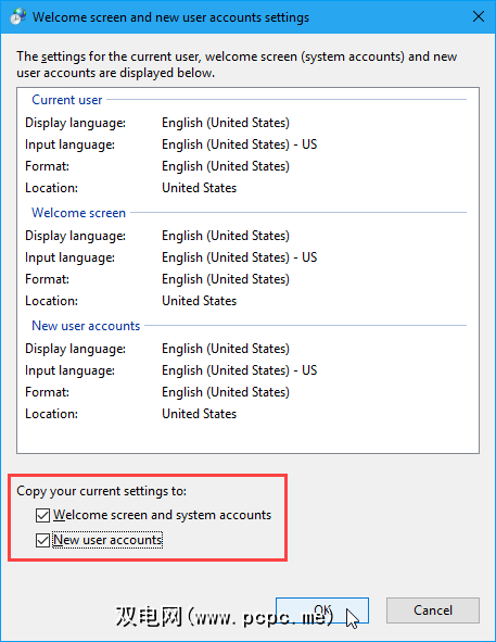 将显示欢迎屏幕和新用户帐户设置对话框,其中显示了的当前显示语言。当前用户,欢迎屏幕和新用户帐户。您不能在此处更改这些单独的设置,但是可以通过选中欢迎屏幕和系统帐户和新用户帐户框,将当前显示语言设置为新的系统默认语言。 。
