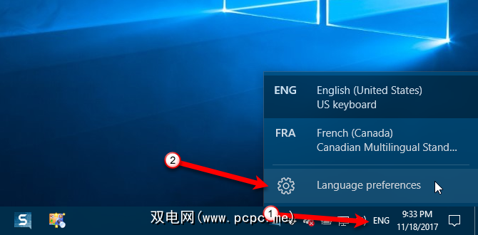 计算机上有多种语言时,访问语言设置的最简单方法是单击任务栏上的语言指示器并单击语言首选项。